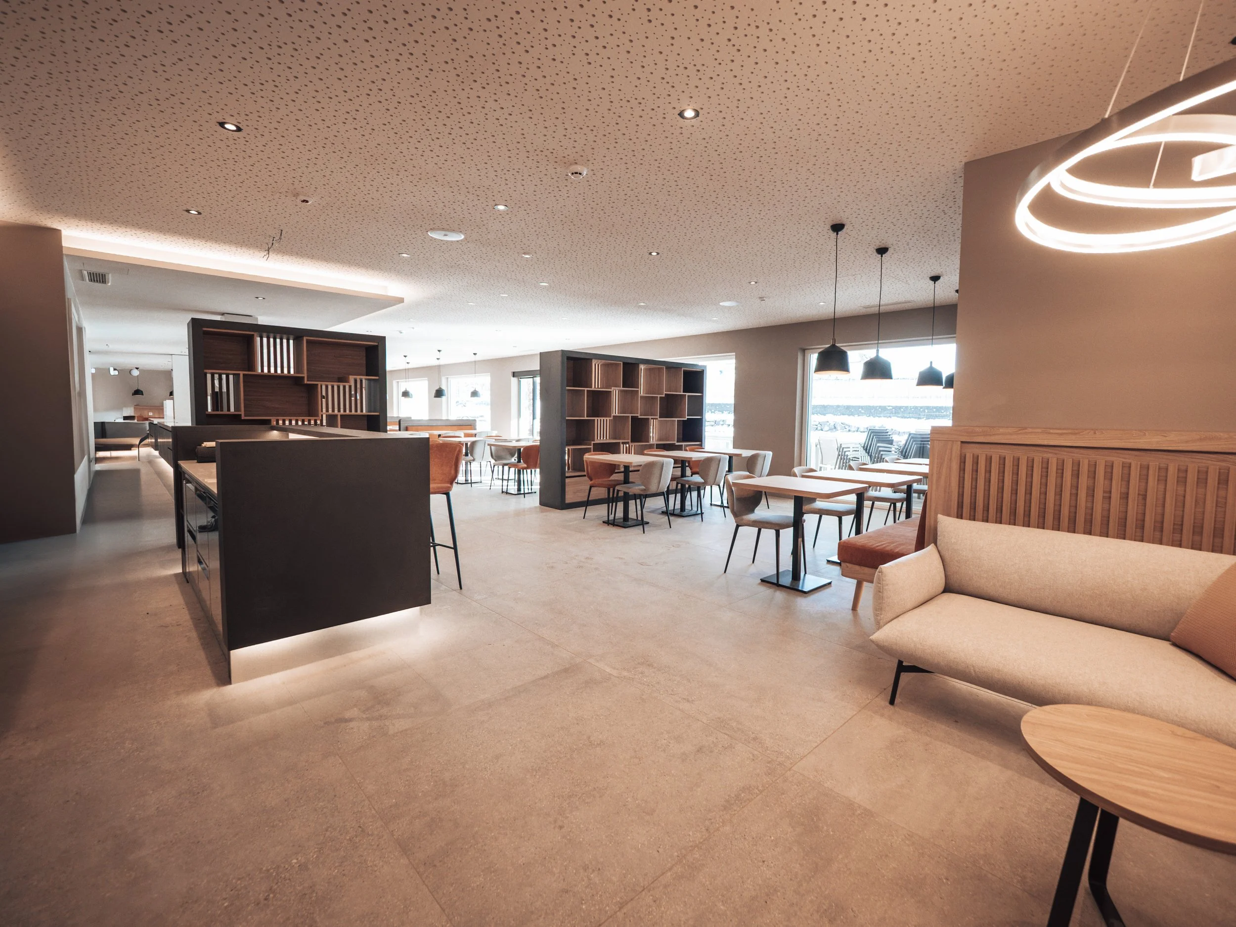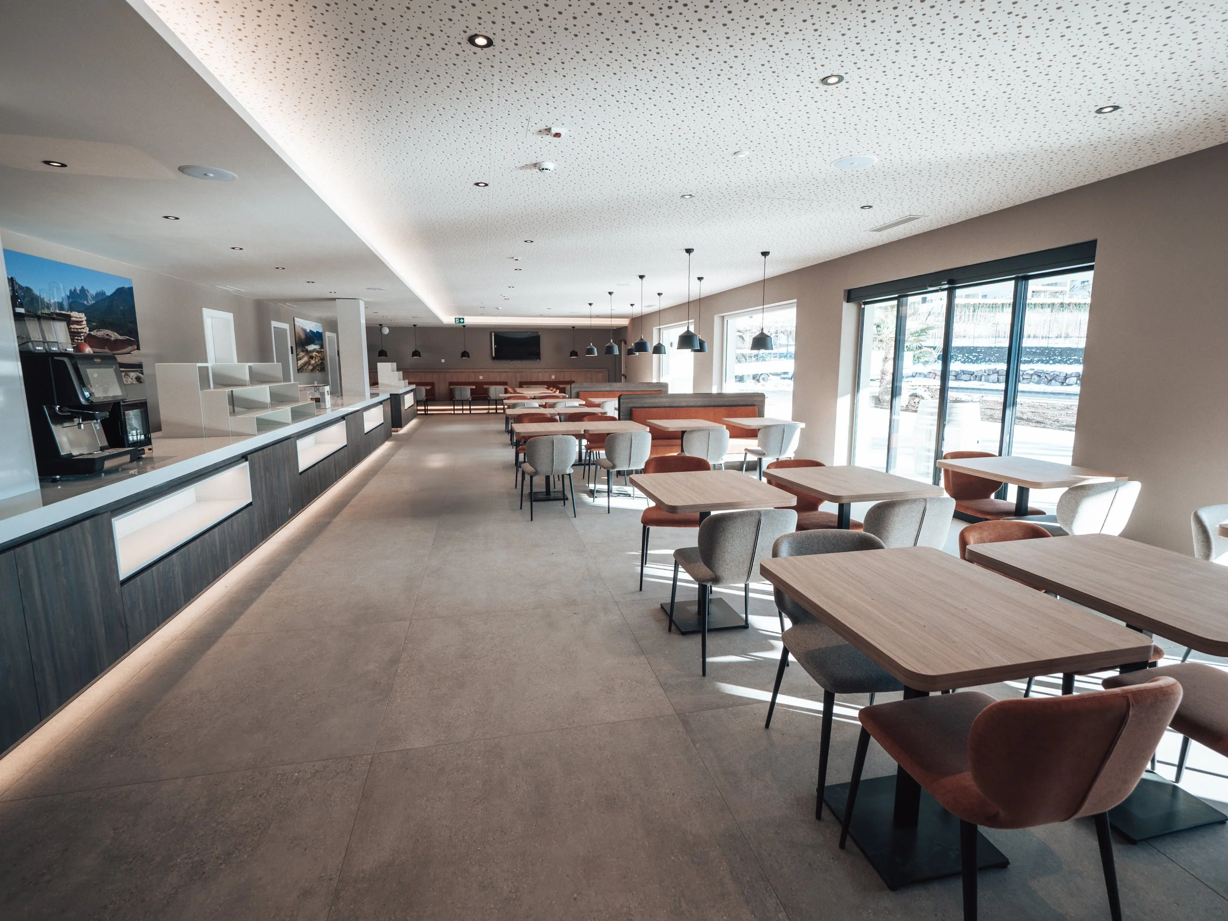 Die Zimmer sind als präzise eingeschnittene Räume mit geschützten Terrassen konzipiert. Im Dachgeschoss erweitert sich das Gebäude um Orte der Ruhe – mit Blick über das Bozner Becken bis in die Berge.